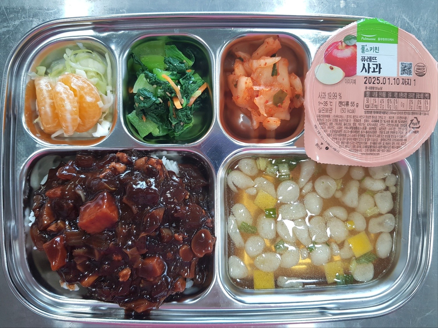 점심 ~ 짜장밥, 우동장국, 청경채나물, 사과푸딩, 감귤양배추샐러드, 배추김치