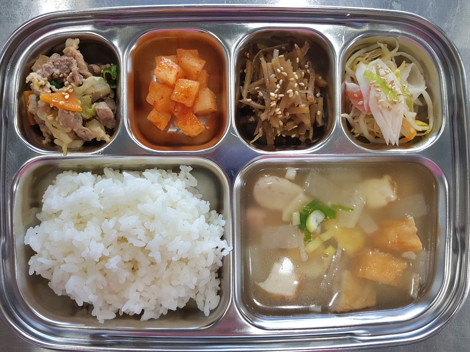 점심 ~ 흰쌀밥, 모듬어묵국, 돈야채불고기, 크래미콩나물무침, 우엉채볶음, 홍시깍두기