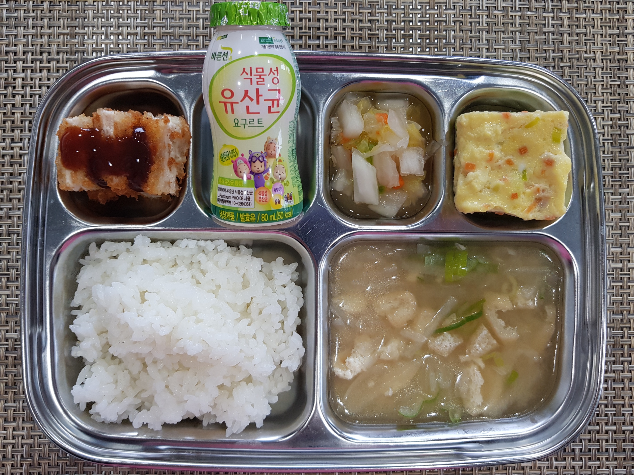 점심~ 흰쌀밥,유부무채된장국, 치킨까스*소스, 영양계란찜, 백김치, 요구르트