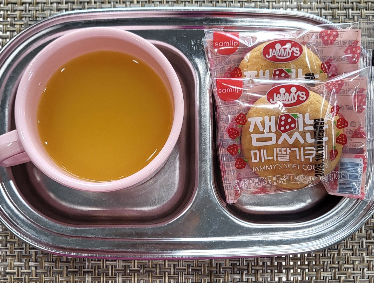 점 심 ~ 보리쌀밥, 호박두부된장국, 새우살버섯볶음, 연두부*양념장, 짜요짜요(딸기), 배추김치