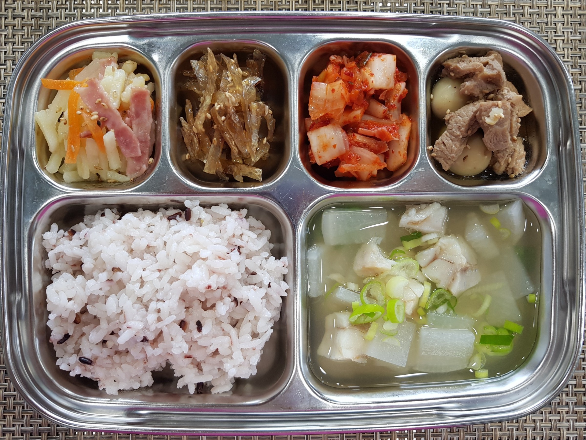 점 심 ~ 흑미밥, 동태무국, 메추리알돈육장조림, 베이컨감채볶음, 쥐포채조림, 배추김치