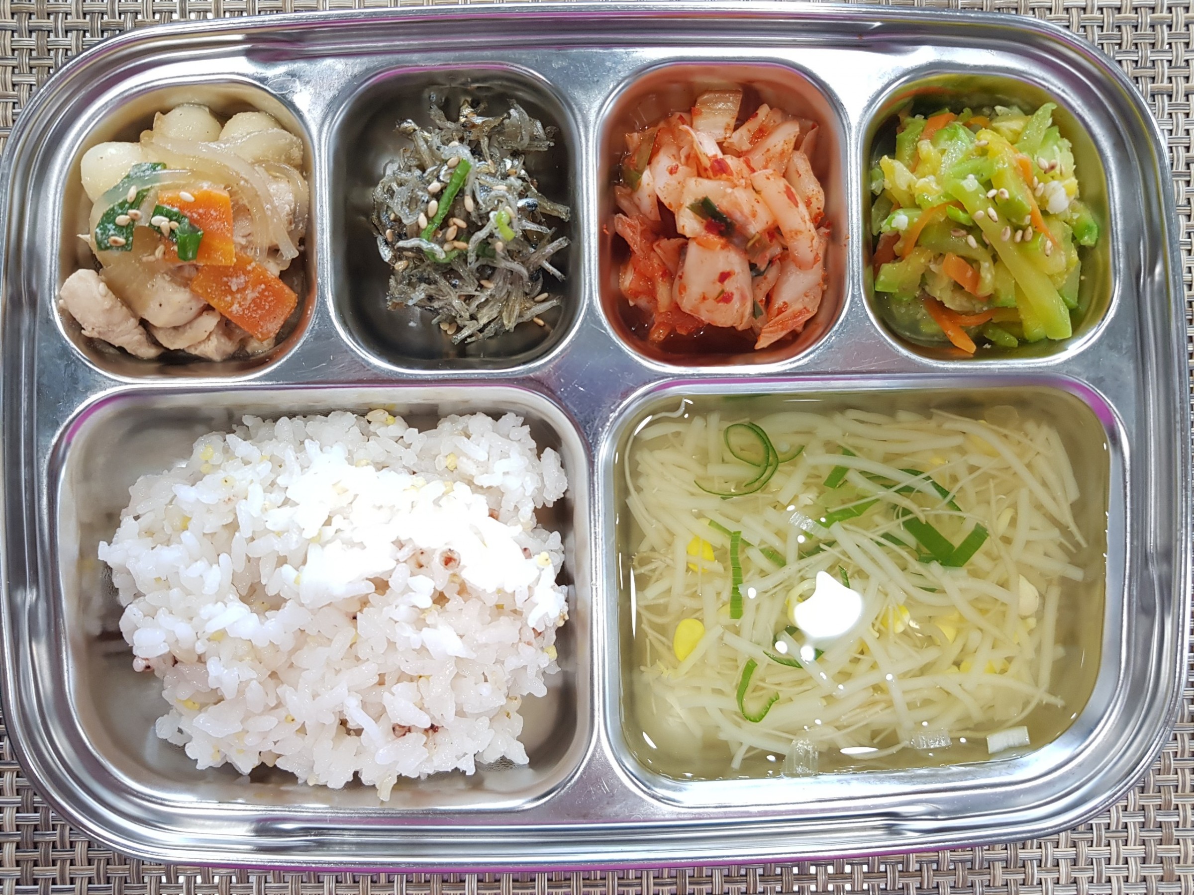 점 심 ~ 잡곡밥, 맑은콩나물국, 조랭이떡 닭갈비, 애호박나물, 멸치볶음, 배추김치