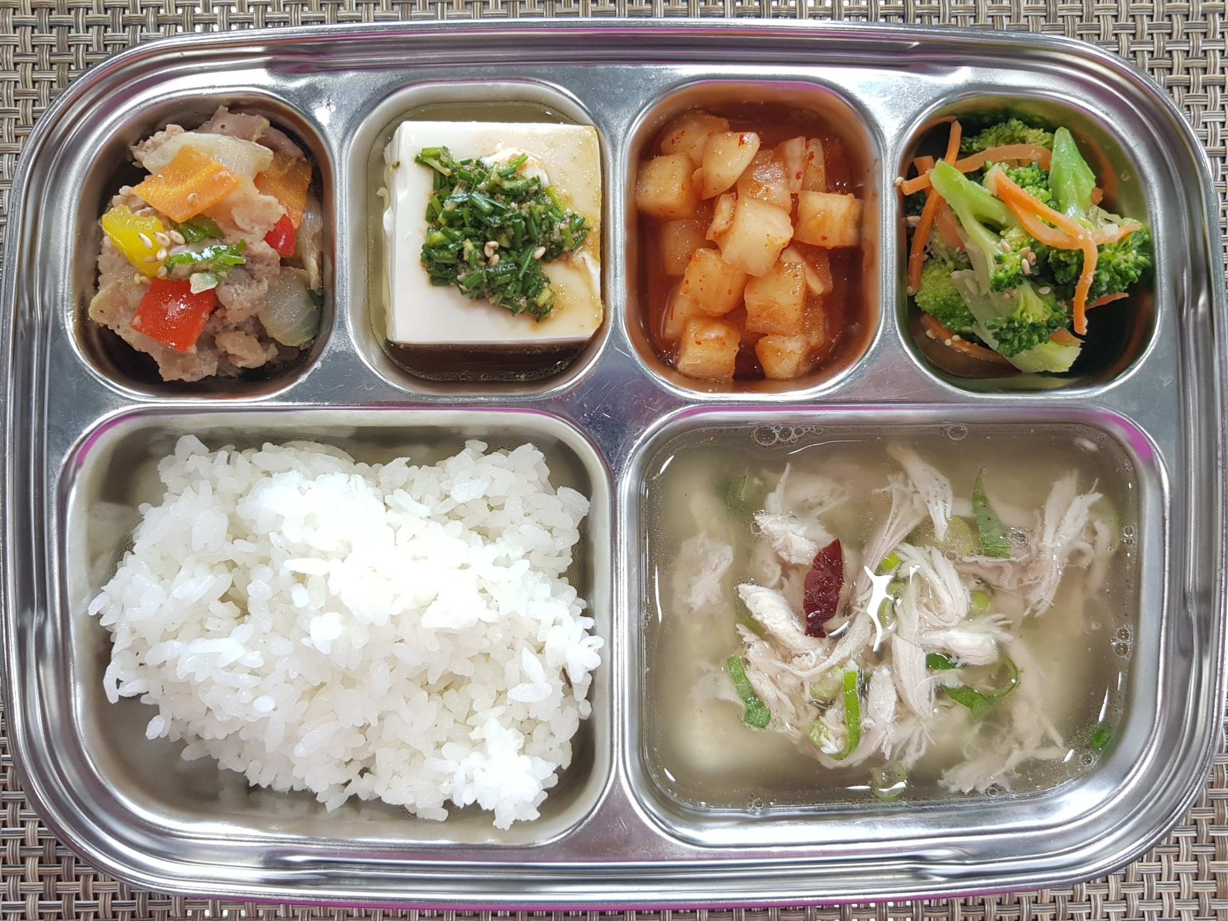 점 심 ~ 찹쌀밥, 닭곰탕, 돈야채두르치기, 브로콜리무침, 연두부*양념장, 홍시깍두기