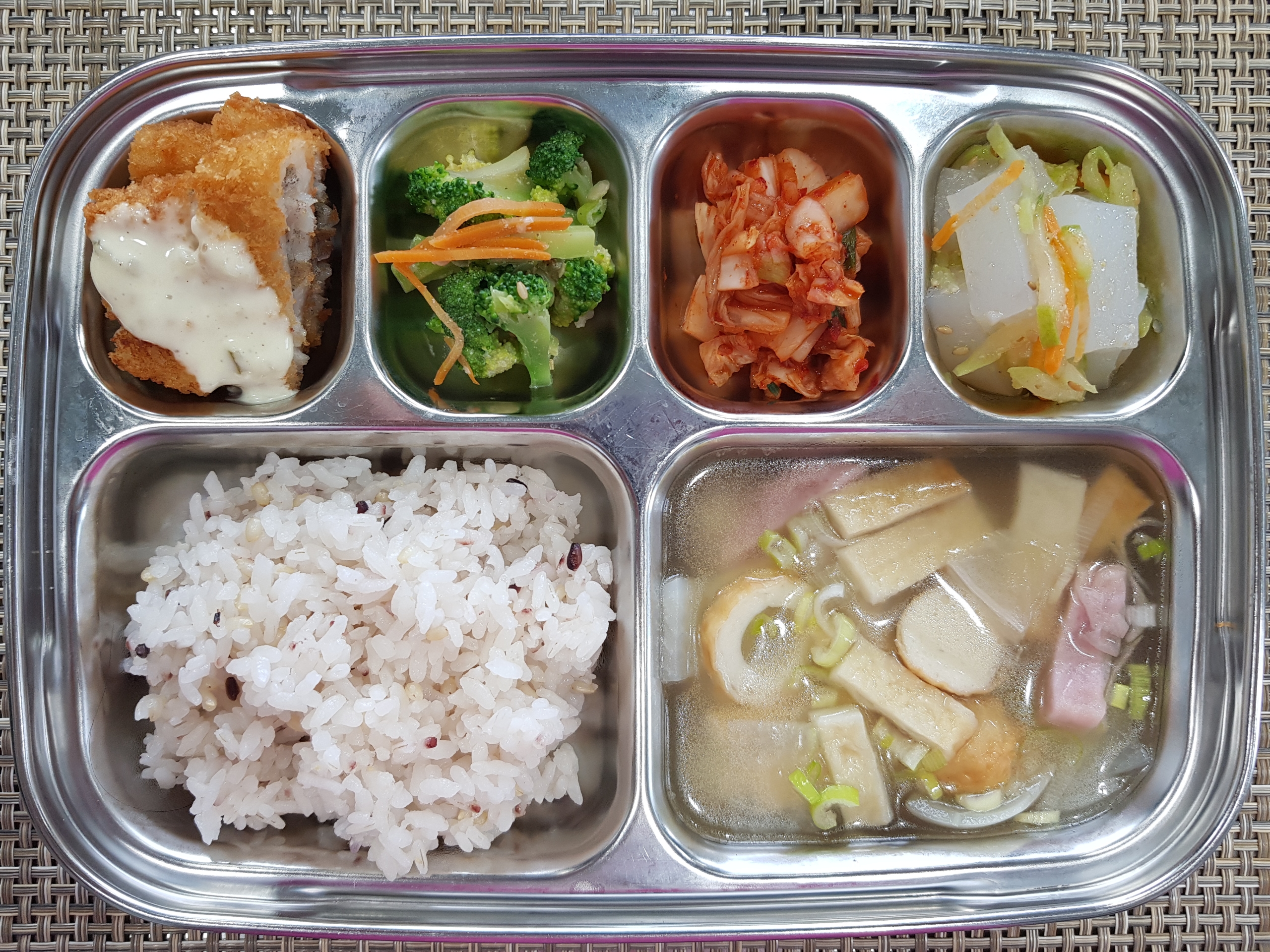 점심 ~ 혼합잡곡밥, 모듬어묵국, 생선까스*타르타르소스, 청포묵무침, 브로콜리무침, 배추김치