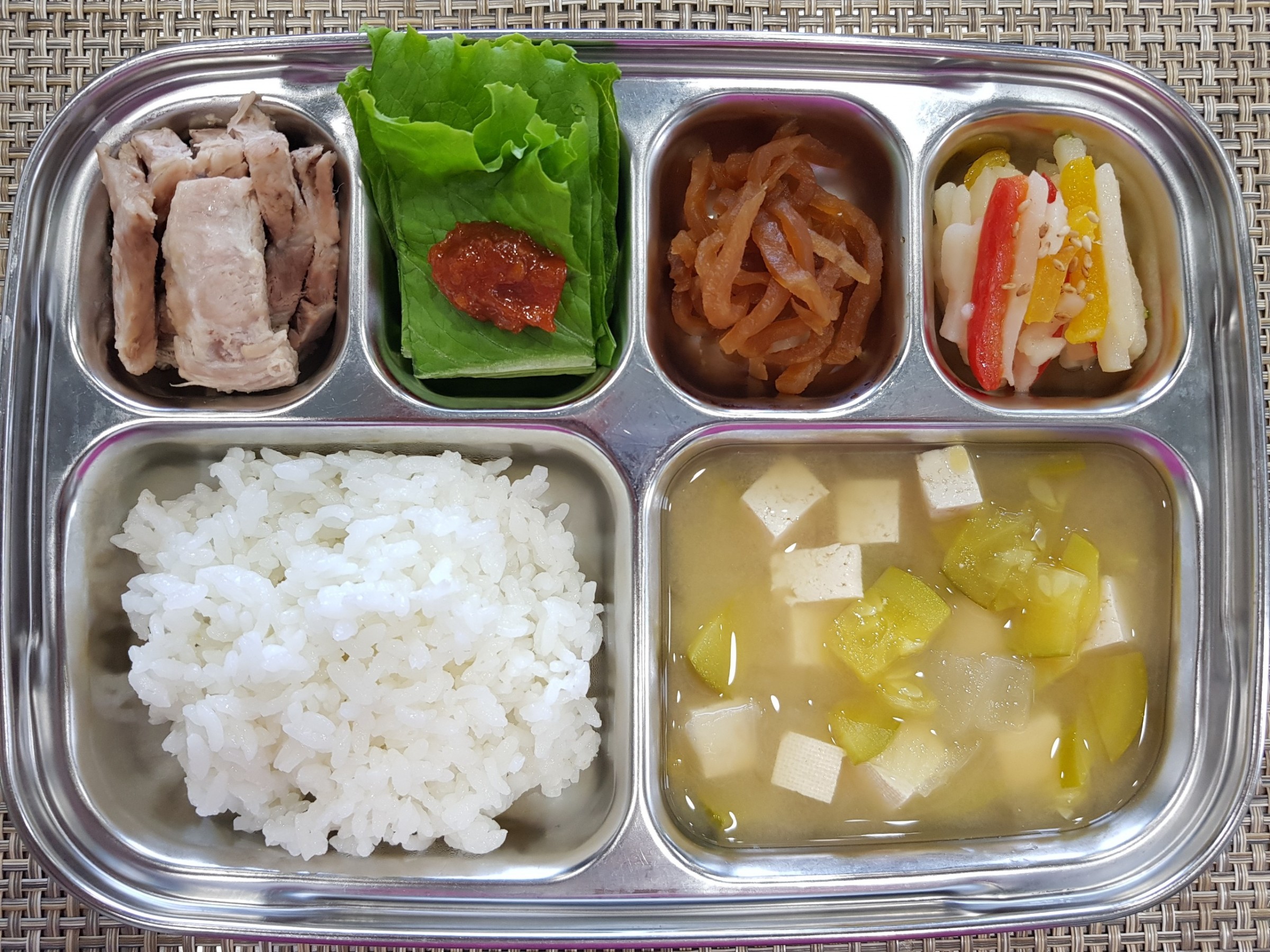 점 심 ~ 흰쌀밥, 애호박두부된장국, 수육, 쌈채소*쌈장, 파프리카감자채볶음, 무 간장장아찌