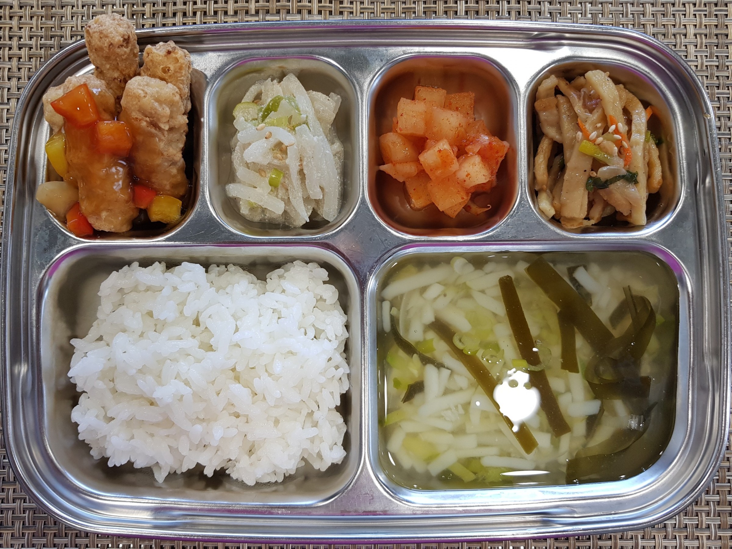 점 심 ~ 흰쌀밥, 다시마감자국, 탕수육*소스, 어묵야채볶음, 들깨무나물, 홍시깍두기
