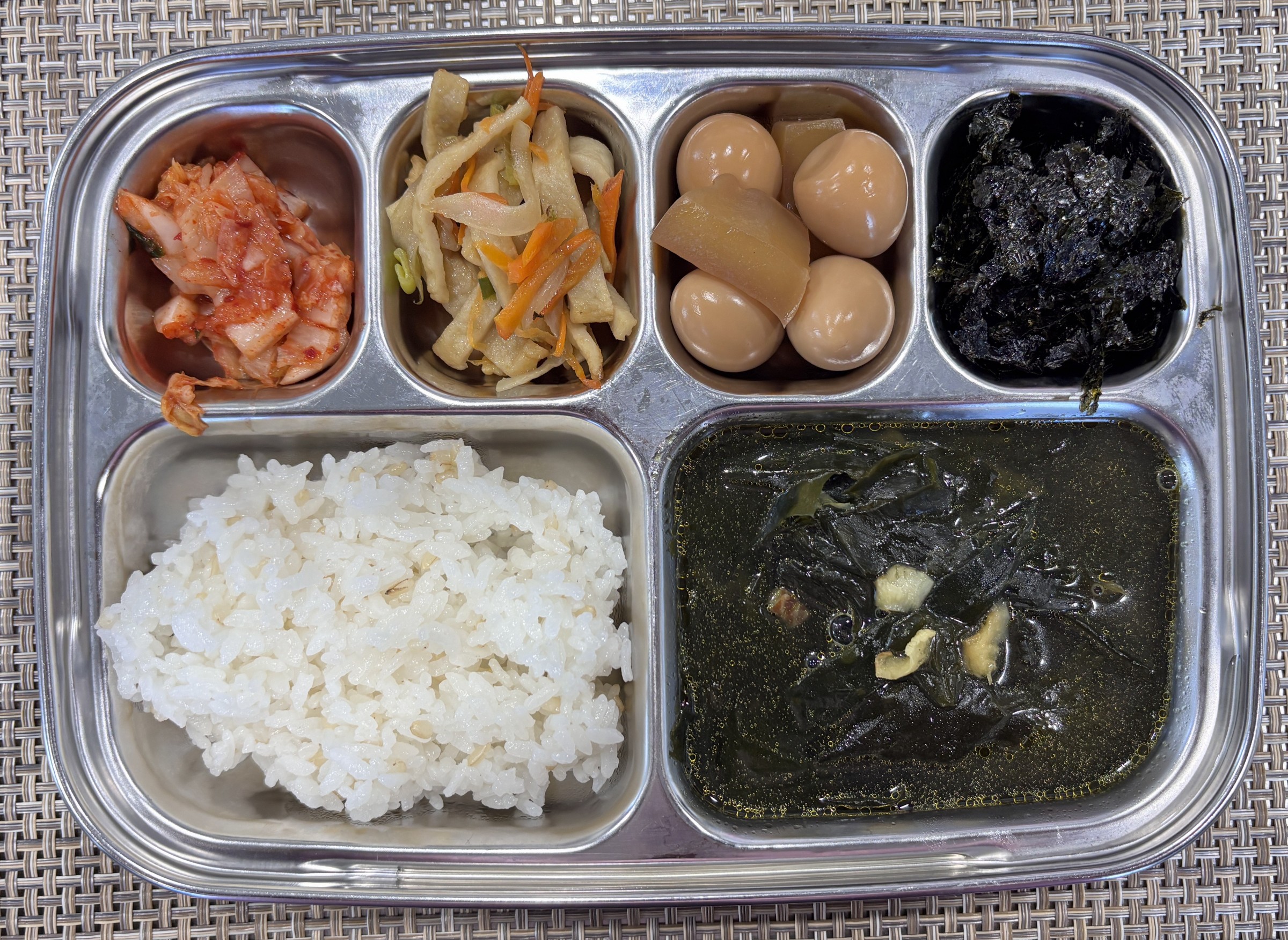 점 심 ~ 현미찹쌀밥, 황태미역국, 곤약메추리알장조림, 어묵야채볶음, 조미김, 배추김치