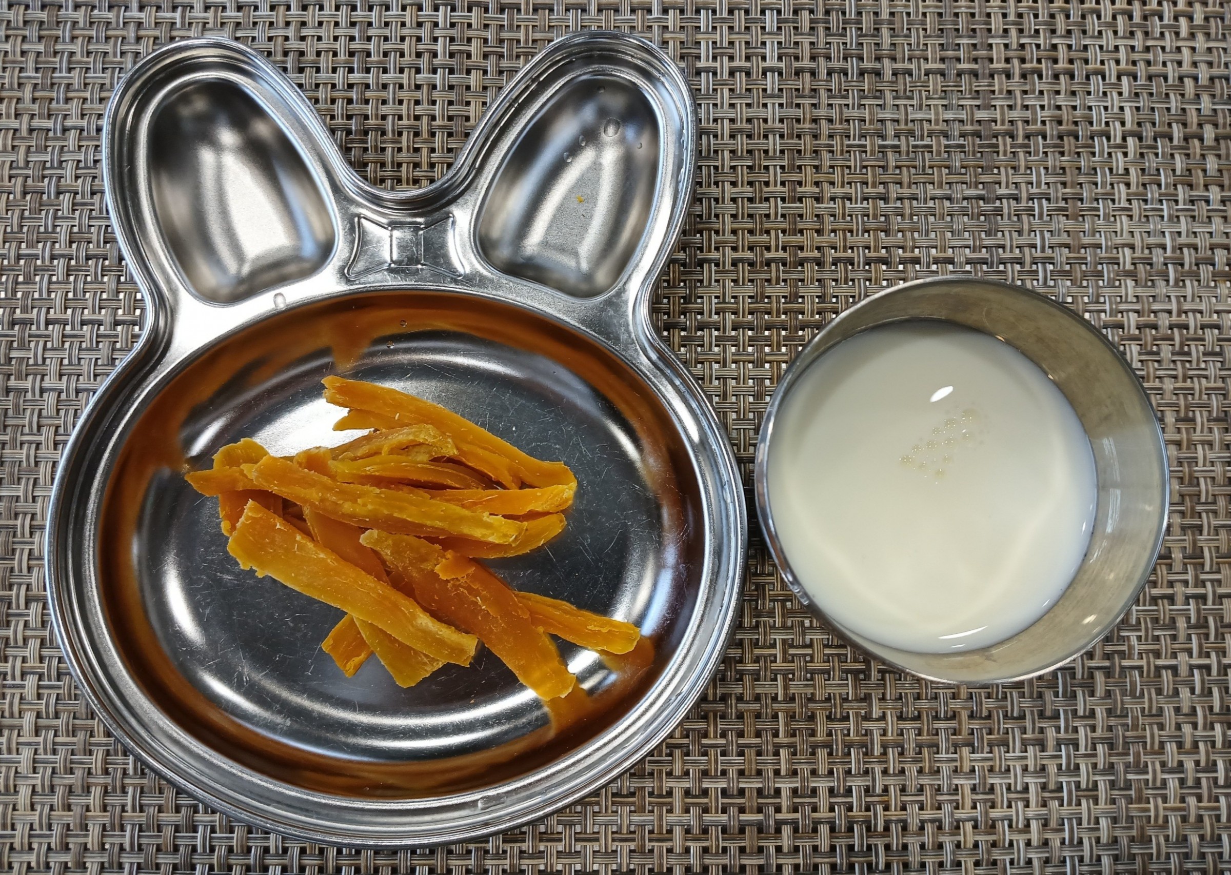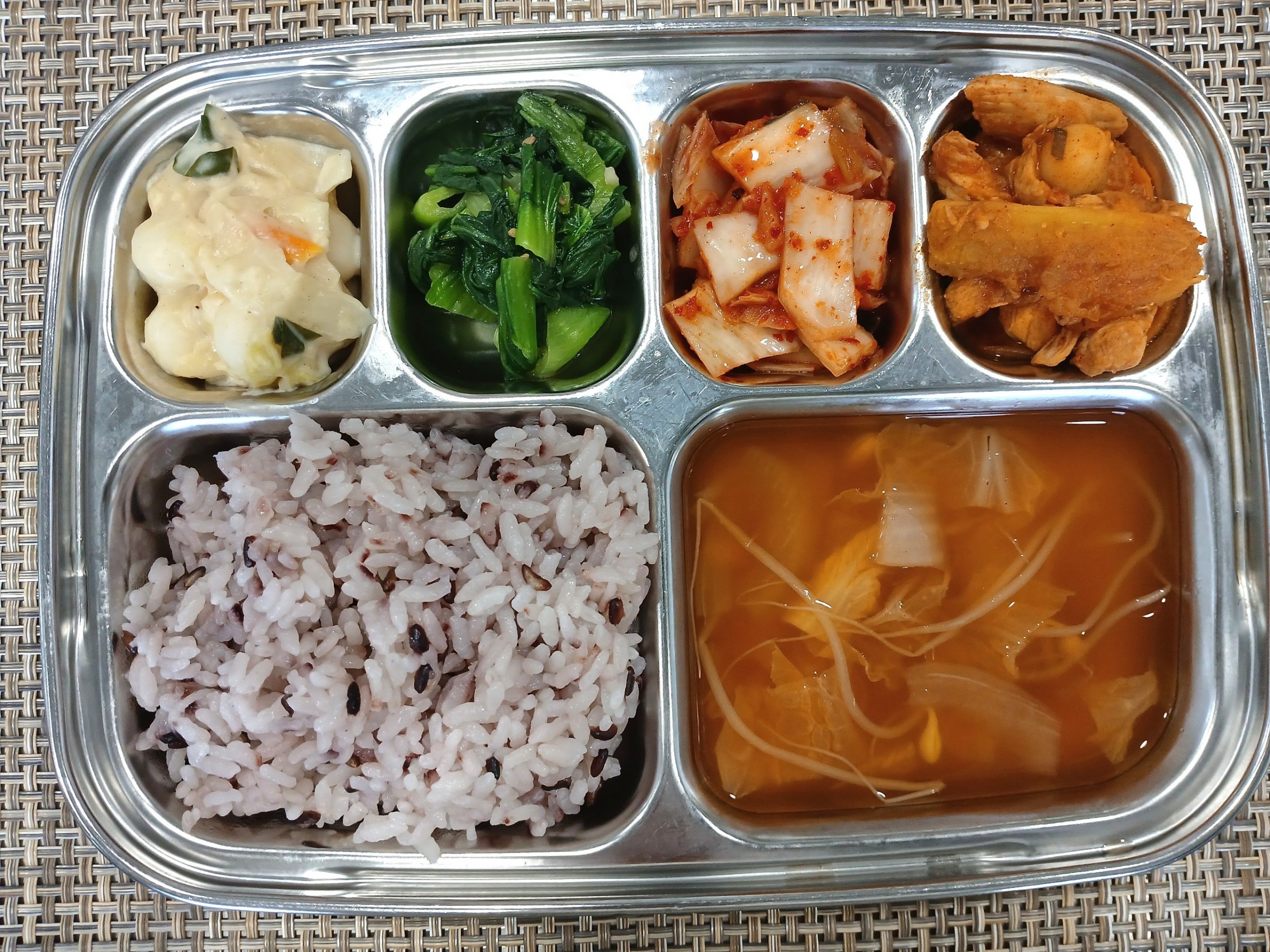 점심 ~ 흑미밥, 김치콩나물국, 고구마떡닭갈비, 청경채나물, 크림떡볶이, 배추김치