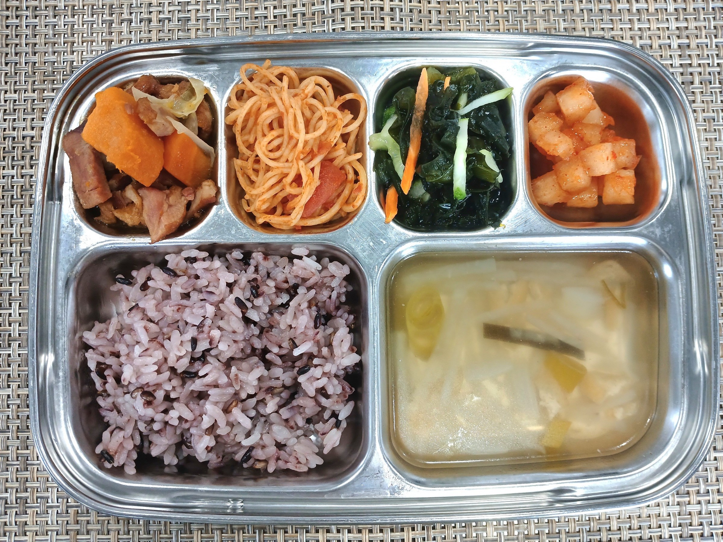 점 심 ~ 흑미밥, 유부무채다시마국, 오리훈제단호박찜, 미역오이초무침, 토마토스파게티, 홍시깍두기