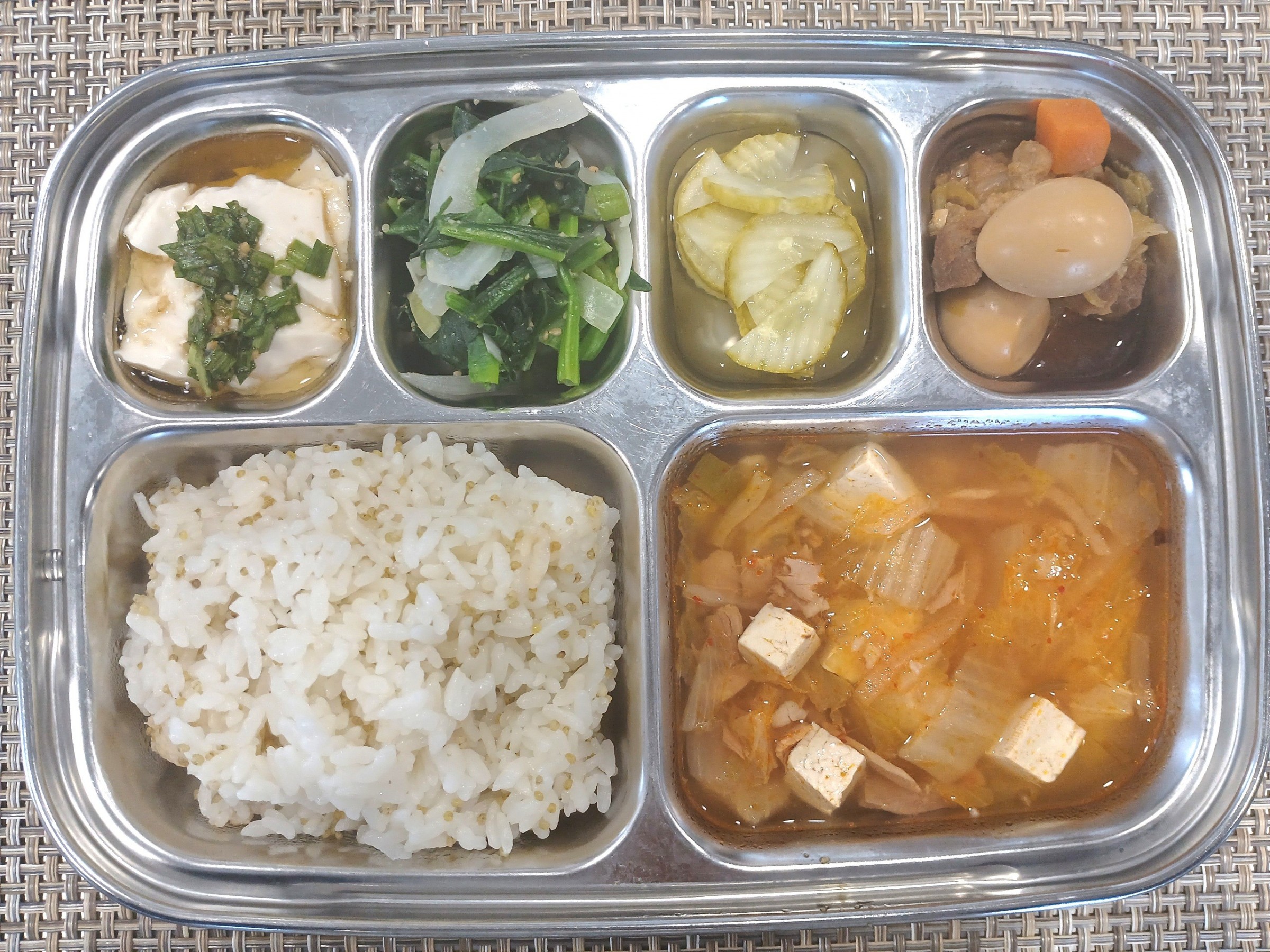 점 심 ~ 차조밥, 참치김치찌개, 돈메추리알장조림, 연두부*양념장, 시금치나물, 오이피클