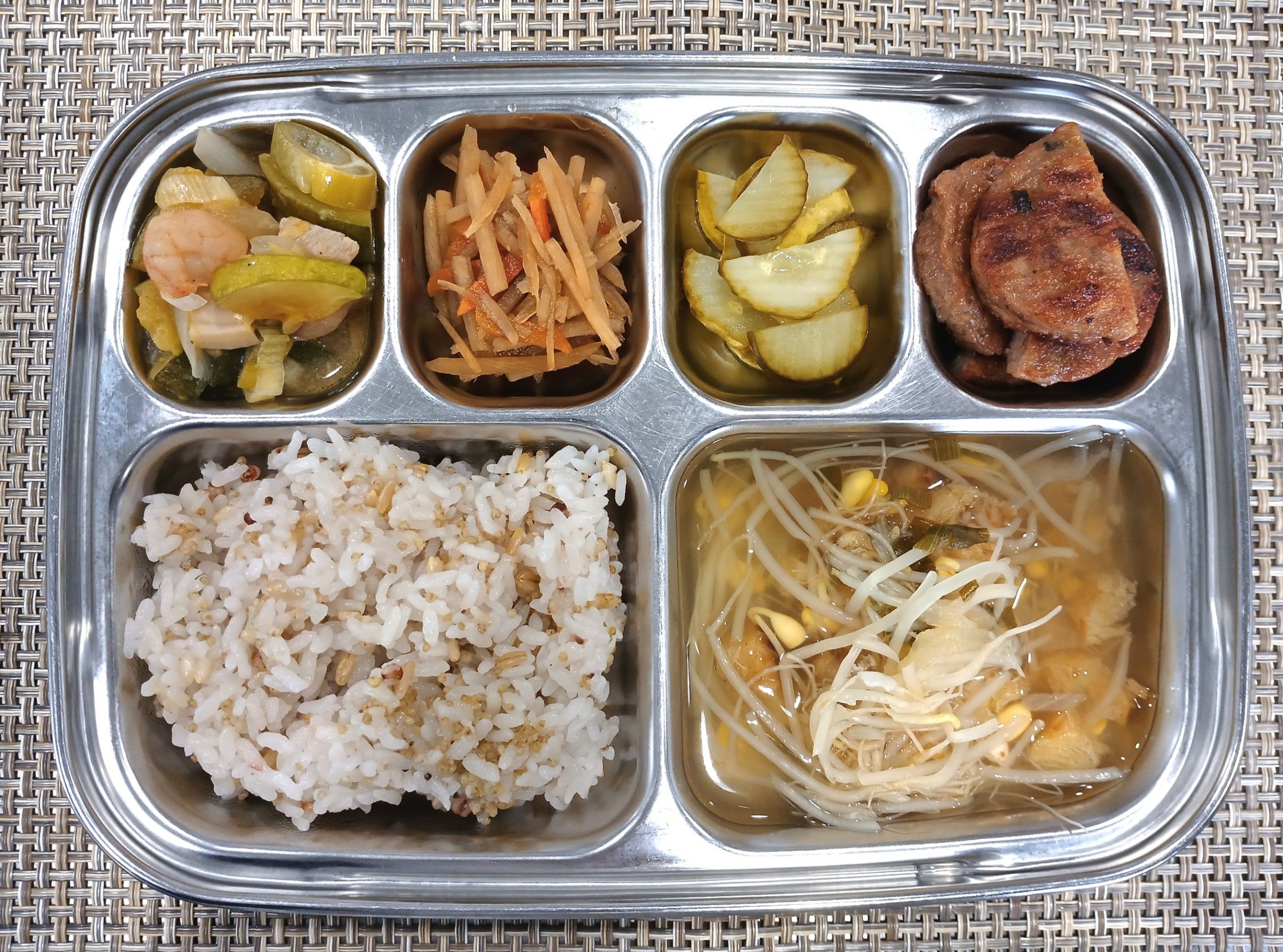 점 심 ~ 잡곡밥, 황태콩나물국, 떡갈비, 애호박새우살볶음, 우엉채조림, 오이피클
