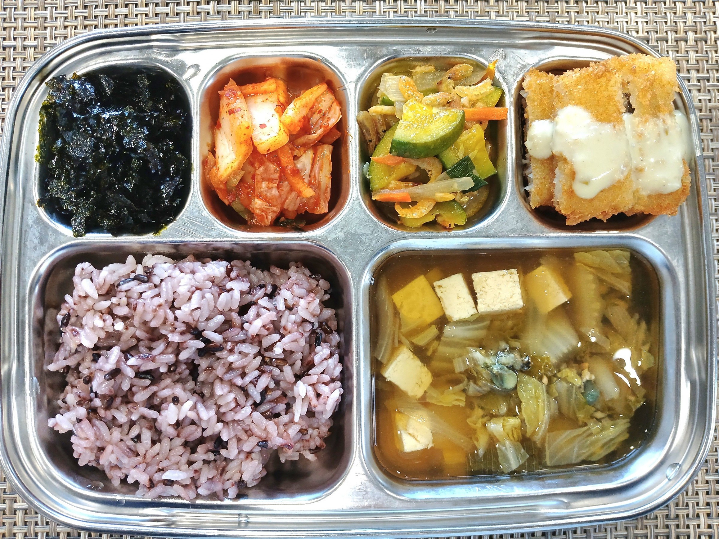 점 심 ~ 흑미밥, 올갱이배추된장국, 생선까스*타르타르소스, 건새우애호박볶음, 조미김, 배추김치