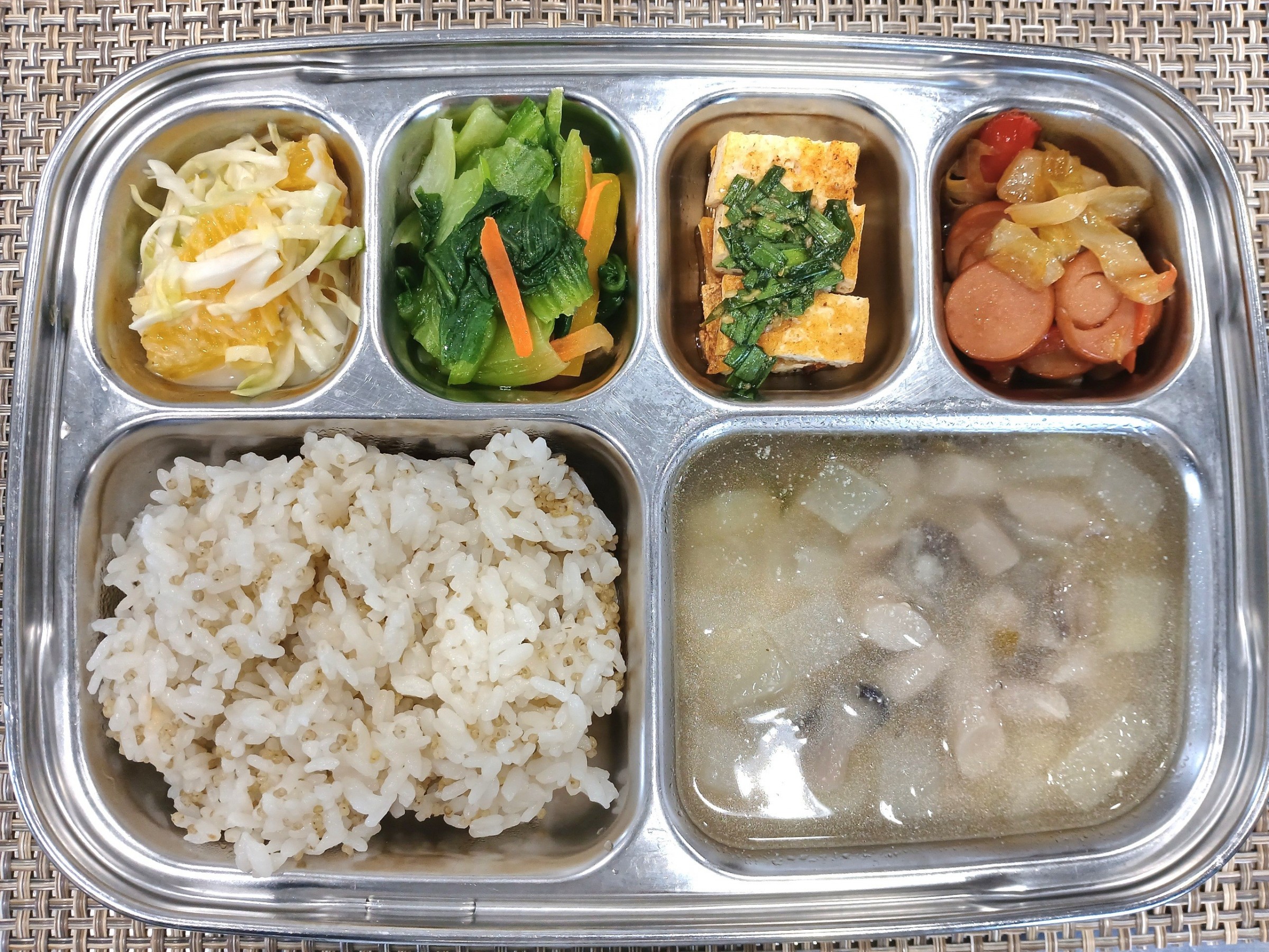 점 심 ~ 차조밥, 들깨느타리버섯국, 소세지야채볶음, 청경채나물 , 두부구이*양념장, 오렌지*양배추샐러드