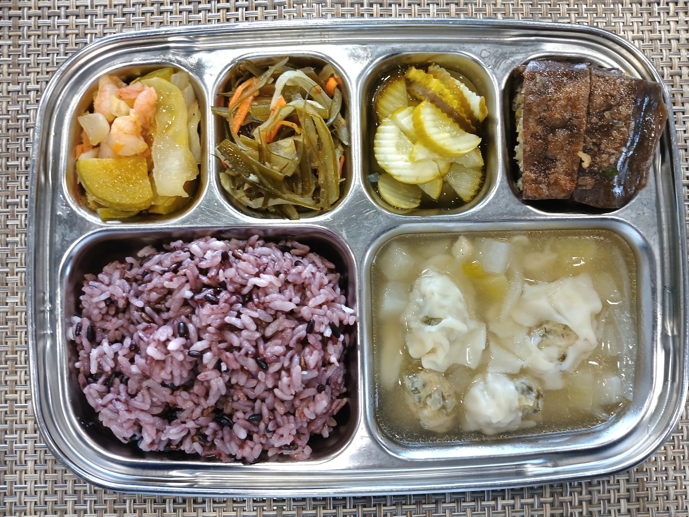 점 심 ~ 흑미밥, 만두국, 고기밀전병부침, 미역줄기볶음, 애호박새우살볶음, 오이피클