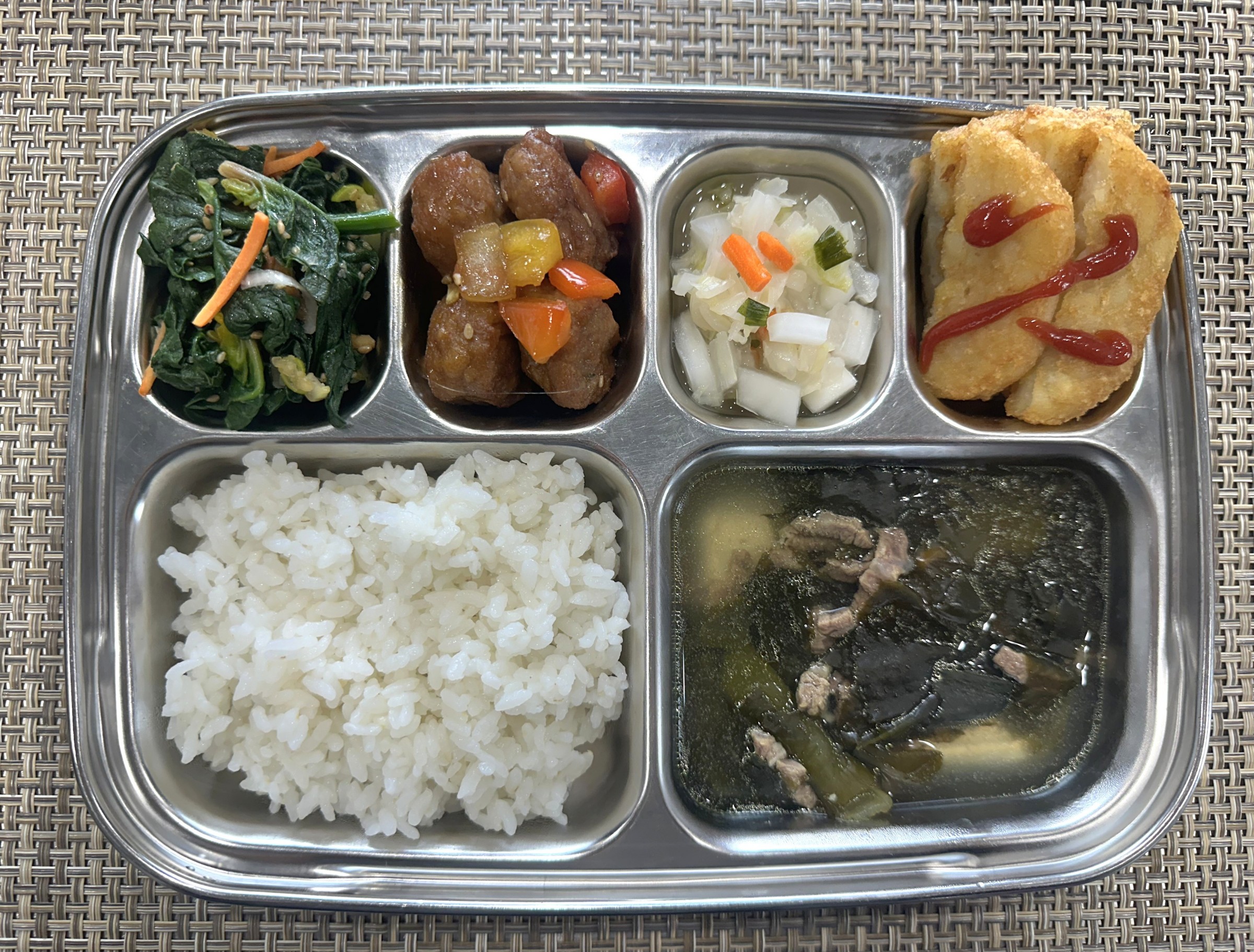 점 심 ~ 흰쌀밥, 소고기미역국, 파르리카미트볼조림, 해쉬브라운*케찹, 시금치나물, 백김치