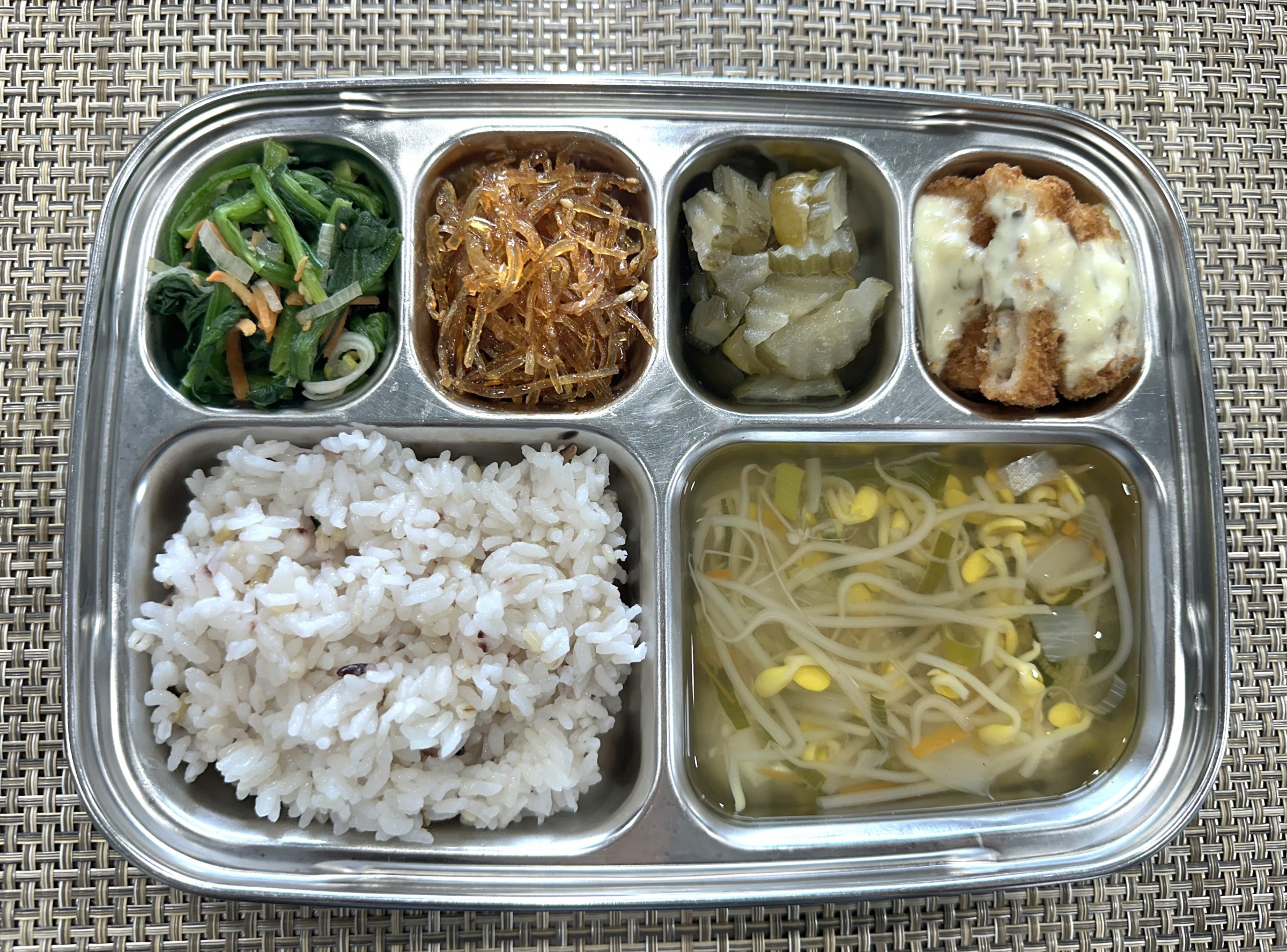 점 심 ~잡곡밥, 맑은콩나물국, 생선까스*타르타르소스, 쥐채볶음, 시금치나물, 오이피클