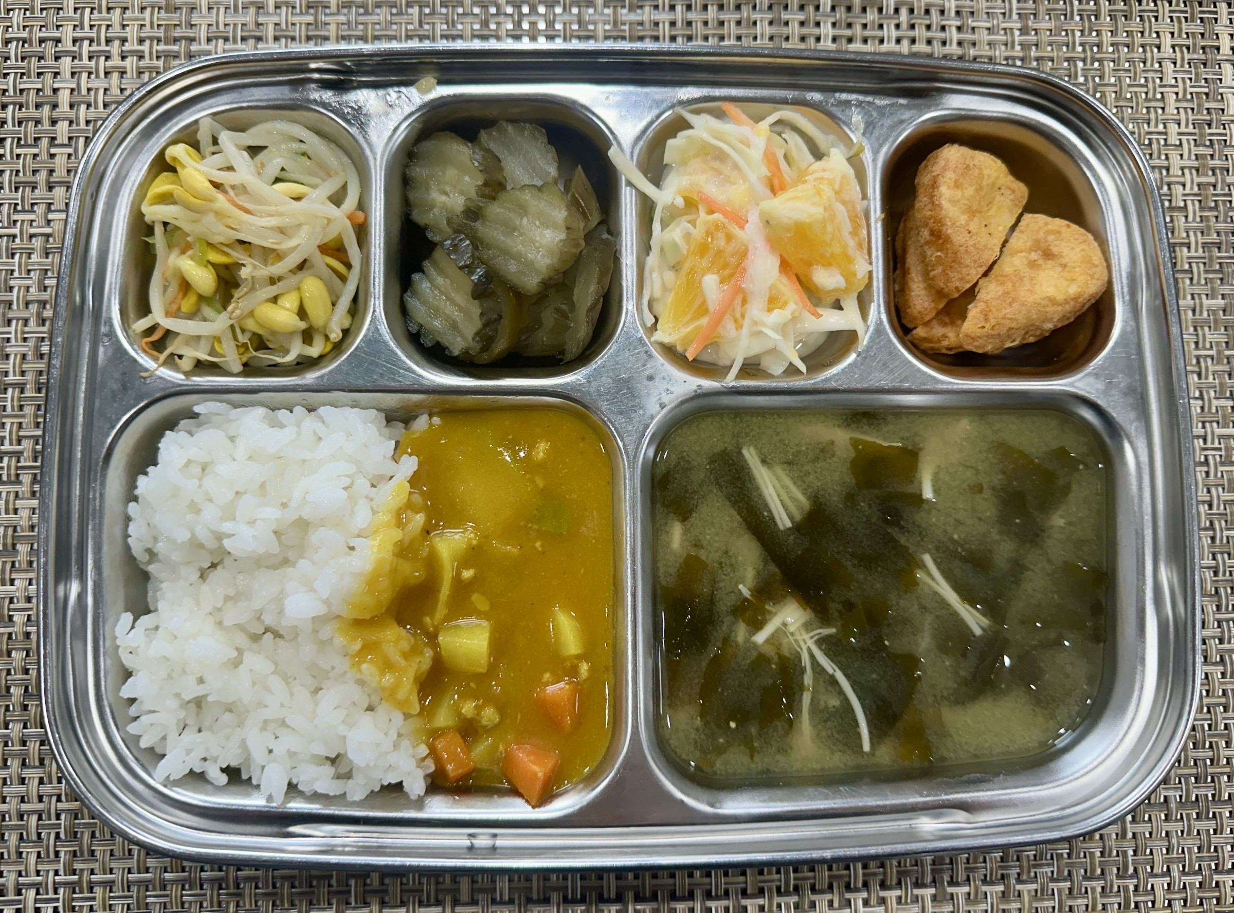 점심 ~ 돈육카레밥, 미역팽이버섯된장국, 치킨너겟*머스타드, 콩나물무침, 오이피클, 오렌지양배추샐러드