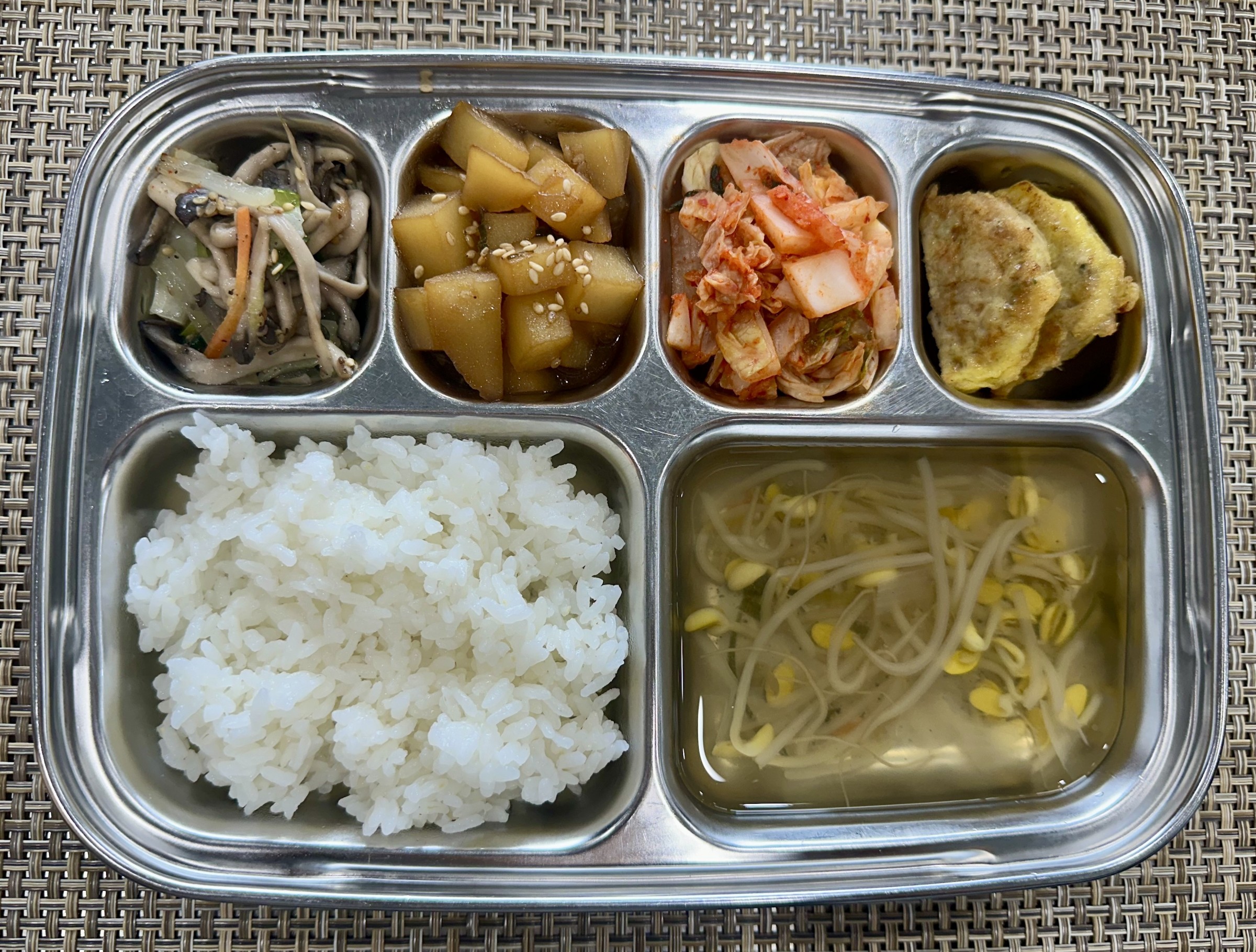 점심 ~ 쌀밥, 콩나물국, 고기동그랑땡부침, 감자조림, 느타리버섯나물, 배추김치